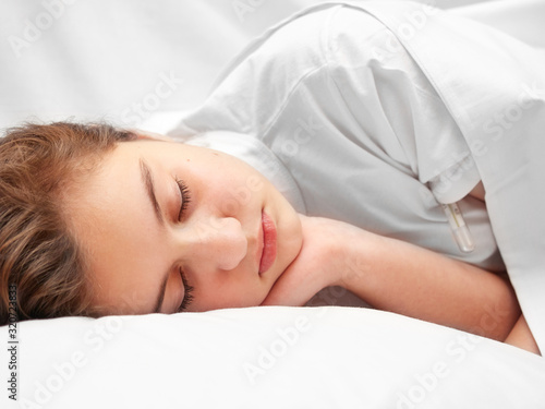 sick girl lying in white bed with a thermometer. . coronavirus