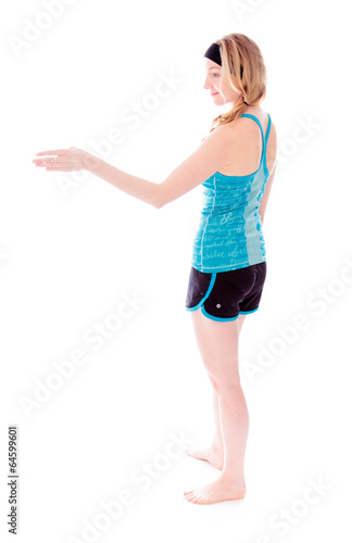 Side profile of a young woman offering hand for handshake