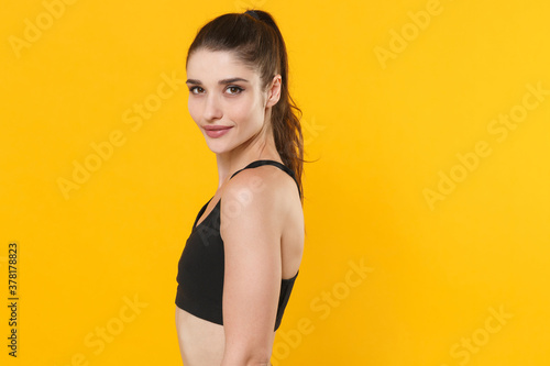Side view of smiling young fitness sporty woman 20s wearing black sportswear posing training working out standing looking camera isolated on bright yellow color wall background studio portrait.
