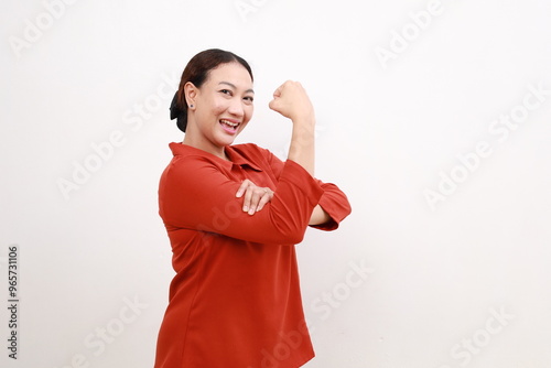Side view young strong employee business woman showing biceps muscles on hand isolated on white background
