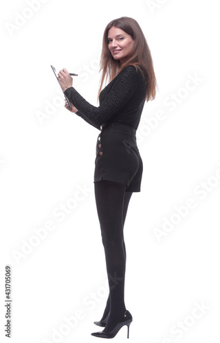 side view. young woman writing something to the clipboard.
