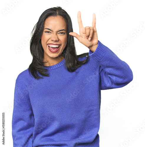 Simple portrait of a young Latina showing a horns gesture as a revolution concept.