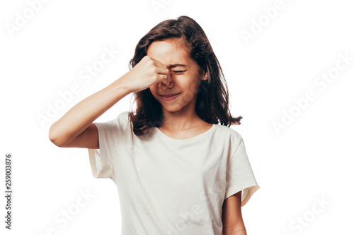 Sinus pain, sinus pressure, sinusitis. Sad child holding her nose and head because sinus pain