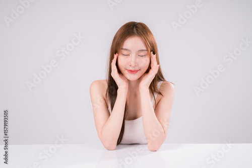 Skin Care Woman Asian Person Smile White Beauty Young Portrait Face Background, Confident and Radiant Female Model with Healthy Skin On White Background