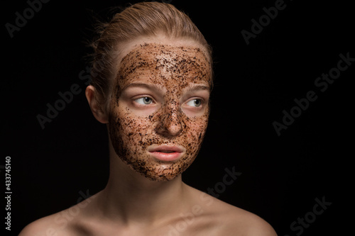 Skin scrub Coffee grounds mask on the face of a beautiful young woman Organic natural cosmetology dark studio background Isolate