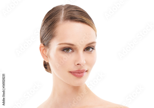 Skincare, beauty and portrait of woman with smile on face and salon hair style on white background. Health, wellness and luxury cosmetics, healthy body care and headshot of beautiful studio model.