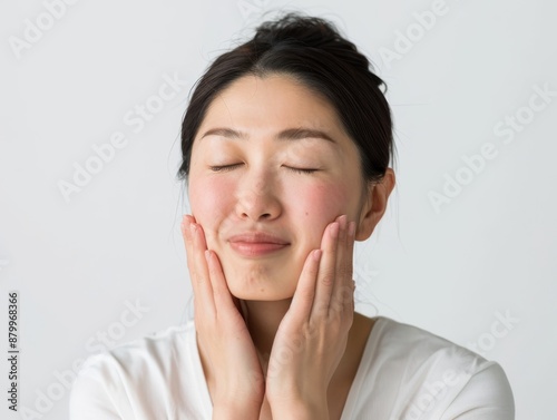 Skincare with beautiful Japanese Korean woman in her late thirties, with dark hair and wearing a white sleeveless top. Facial treatment, Cosmetology, Spa, Aesthetic, plastic surgery