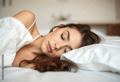 Sleeping female person on a soft bed with a minimalist room