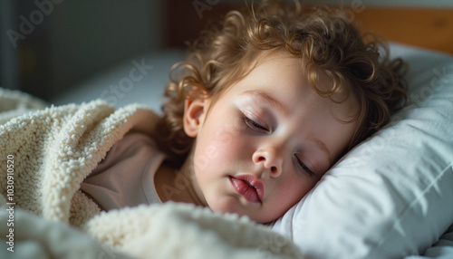 Sleeping toddler peacefully resting under cozy blanket in bed