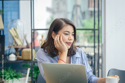 Sleepy Asian woman drinking hot coffee while working in cafe, lifestyle concept.