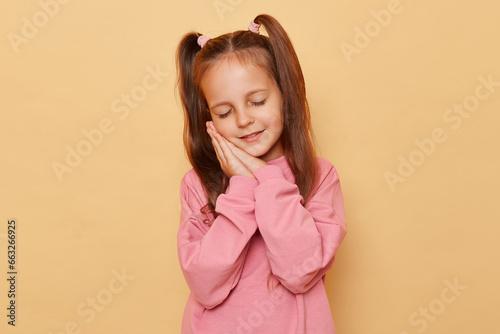 Sleepy little girl with ponytails wearing pink sweatshirt posing isolated over beige background leaning on he hands keeps eyes closed having nap after school.