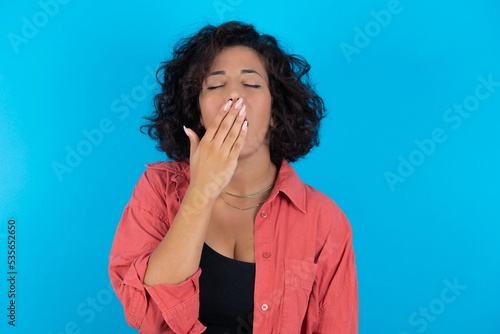 Sleepy young beautiful woman with curly short hair wearing red overshirt yawning with messy hair, feeling tired after sleepless night, yawning, covering mouth with palm.
