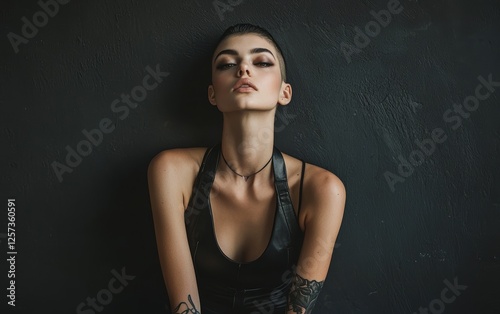 Slim and tall woman with edgy style, asymmetric haircut, dark gray background