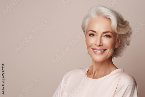 slim pensioner woman positive cosmetology hugs her shoulders smooth skin care self confidence isolated beige color background