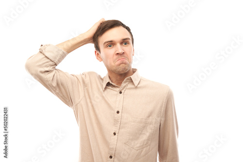 Smart brunette man in casual touches head thinks doubts, makes decision isolated on blue studio background