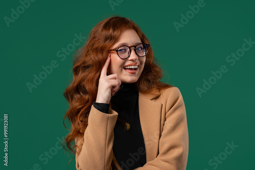 Smart businesswoman gesture-you, think about it. Student looking camera on green