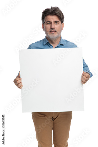 Smart casual man holding an empty billboard