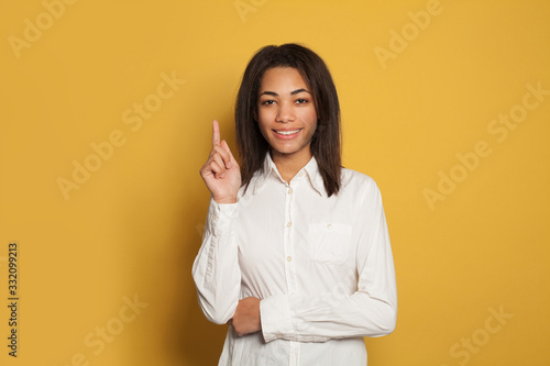 Smart happy african american woman pointing finger up on vivid yellow studio background