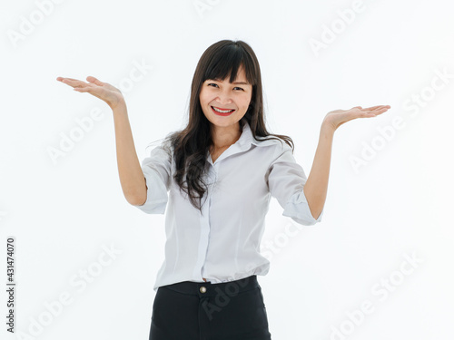 Smart young lady long hair white shirt black pant casual style. Standing smiling point up like showing sign, text, promotion with white background. Portrait good for index finger, advertise.