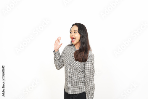 Smile and say Hi or Hello, Waving hand Of Beautiful Asian Woman Isolated On White Background