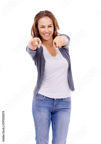 Smile, pointing and portrait of woman on png for decision, vote and choose you. Happy, excited and confidence with female isolated on transparent background for choice, motivation and finger gesture