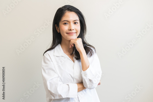 Smile positive, happy asian young woman wearing casual shirt, portrait of pretty female with black long hair feeling prond, standing expression gesture face relax looking at camera on white background