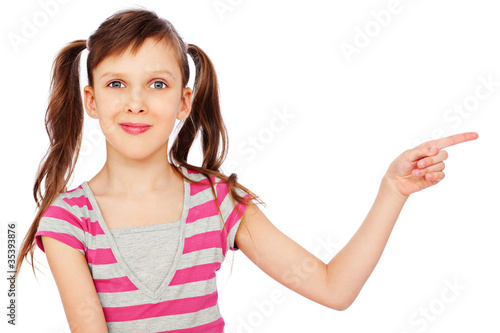 smiley little girl pointing at something