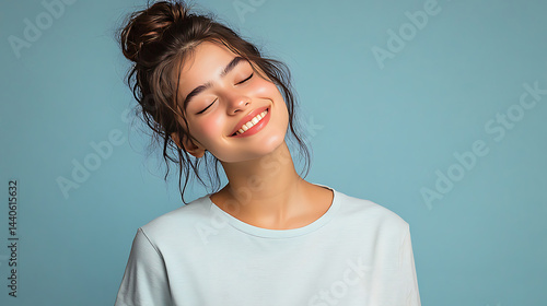 Smiling A young girl with double bun hairstyle on blue background.