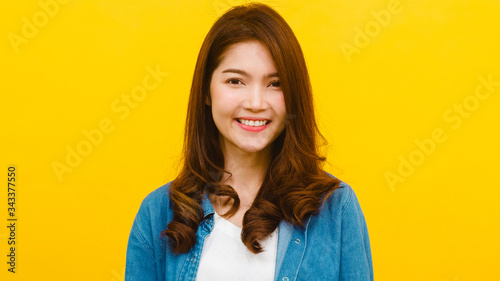 Smiling adorable Asian female with positive expression, smiles broadly, dressed in casual clothing and looking at the camera over yellow background. Happy adorable glad woman rejoices success.