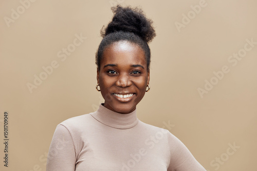 Smiling African woman in beige turtleneck, against a warm brown background, showcasing confidence and elegance, ideal for beauty and fashion themes