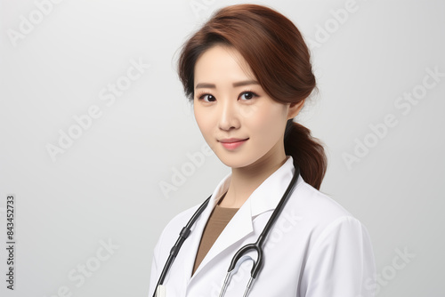Smiling asian woman doctor on white background. Woman doctor. World of Medicine. Personal care profession. Medical studies. European doctor. Asia. Asian doctor. China. Japan. AI.