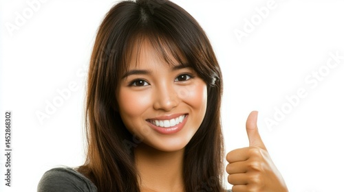 Smiling Asian woman enthusiastically with gives a thumbs up, signaling approval or like on a white background,