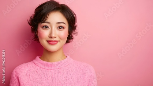 Smiling Asian woman holds vintage camera, ready to shoot Pink