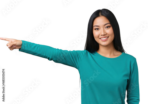 Smiling asian woman pointing left indicating direction with bright teal long sleeve shirt transparent background