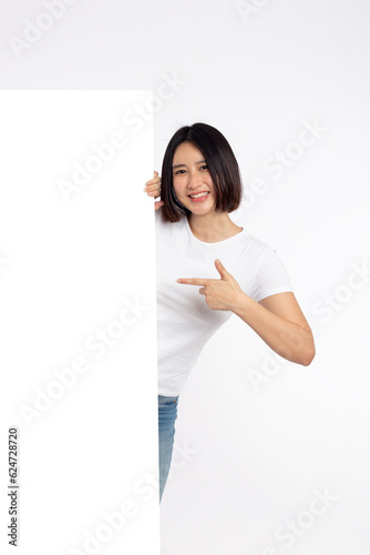 Smiling asian woman presenting something on white blank board with empty space isolated on white background, Awesome promo concept.
