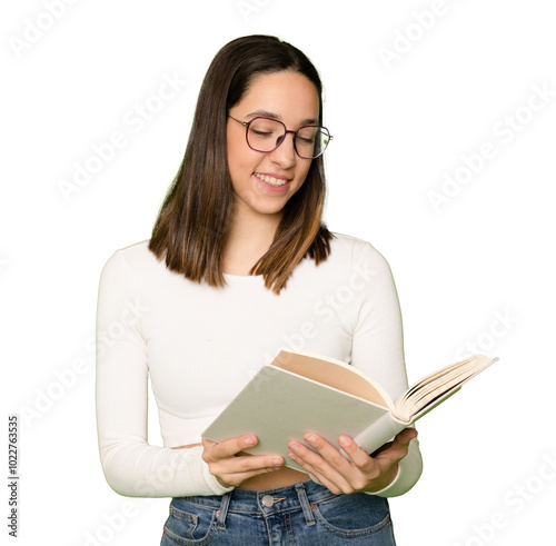 Smiling attractive beautiful pretty young brunette woman 20s wearing posing standing holding in hands reading book over transparent background.