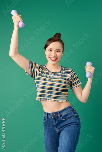 Smiling attractive young Asian woman practicing exercise with dumbell over green background.