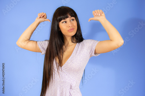 Smiling attractive young brunette woman in casual dress posing isolated over purple background. People lifestyle concept.