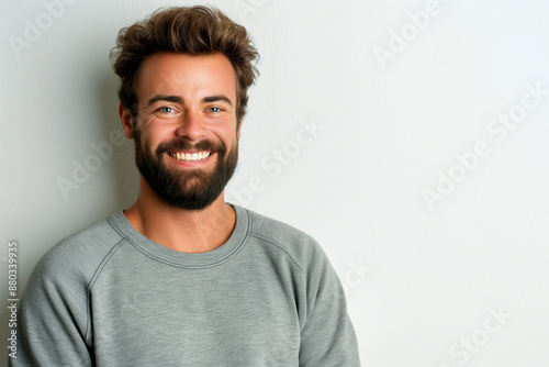 Smiling bearded Caucasian man, wearing a sweatshirt, standing on white background
