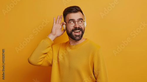 Smiling bearded man with headphones cupping ear to listen better on a vibrant yellow backdrop