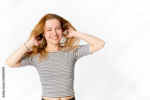 Smiling beautiful caucasian girl with her hands touching hair