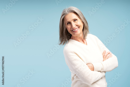 Smiling, beautiful gray haired senior woman with crossed arms looking at camera fashion model posing