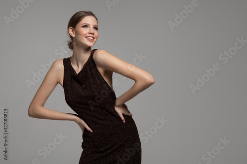 Smiling beautiful woman posing in a tight long dress. Gray background