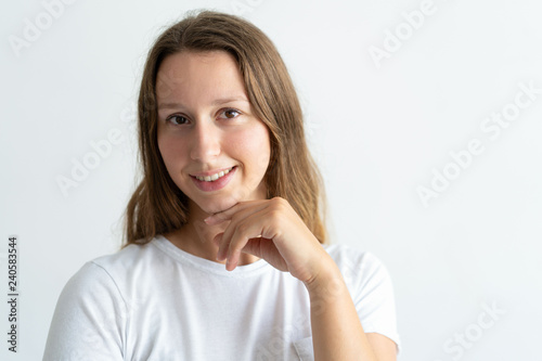 Smiling beautiful young woman posing at camera. Girl touching face and looking at camera. Pretty woman concept. Isolated front view on white background.