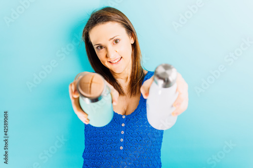 Smiling beautiful young woman with blue background and copy space holding two reusable coffee or tea water bottles. concept reuse plastic free