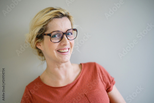 Smiling blond woman with eyeglasses and red shirt, isolated