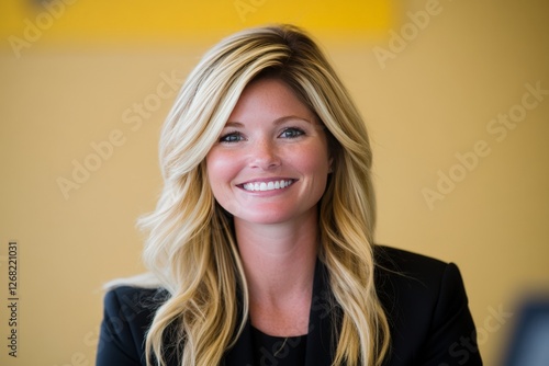 Smiling blonde businesswoman in black blazer standing in modern office exuding confidence professionalism and career success in corporate workplace setting