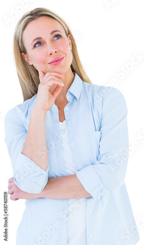 Smiling blonde thinking with hand on chin