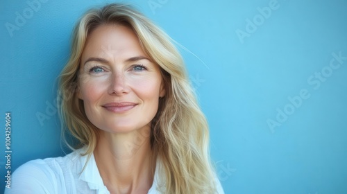 smiling blonde woman confident 40-50 year old female portrait on blue background, stock photography