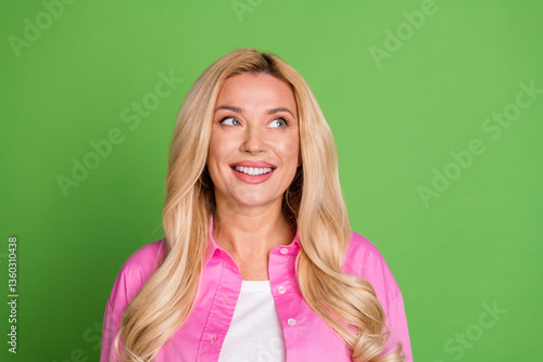 Smiling blonde woman with long hair wearing pink shirt standing against green background expressing joy and optimism